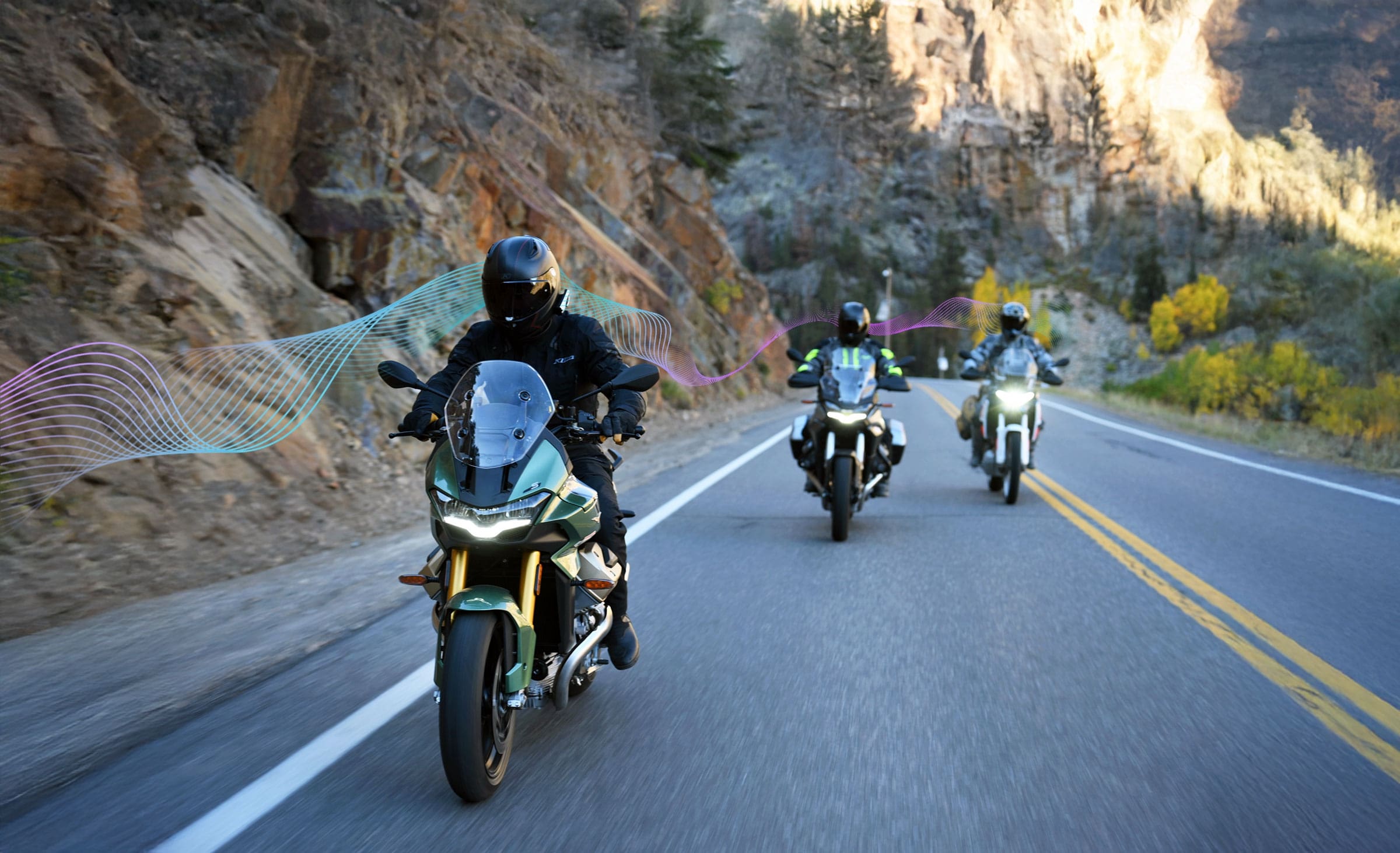 Mesh Intercom umożliwia spontaniczne połączenia z nieograniczoną liczbą motocyklistów na sześciu kanałach. System Wave Intercom oparty na sieci komórkowej pozwala na komunikację grupową bez ograniczeń odległości.